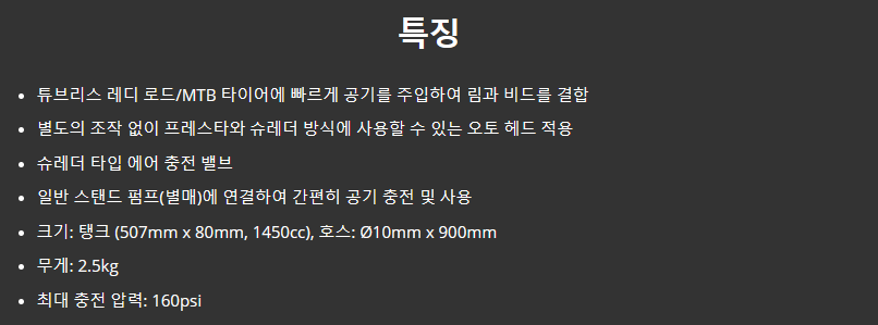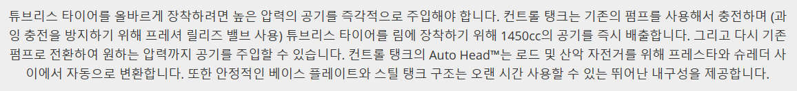 가정에서 콤프레셔 없이 튜블리스 타이어를 설치 시 비드면을 결합하기 위해 압축 공기를 저장/방출하는 탱크 입니다.
